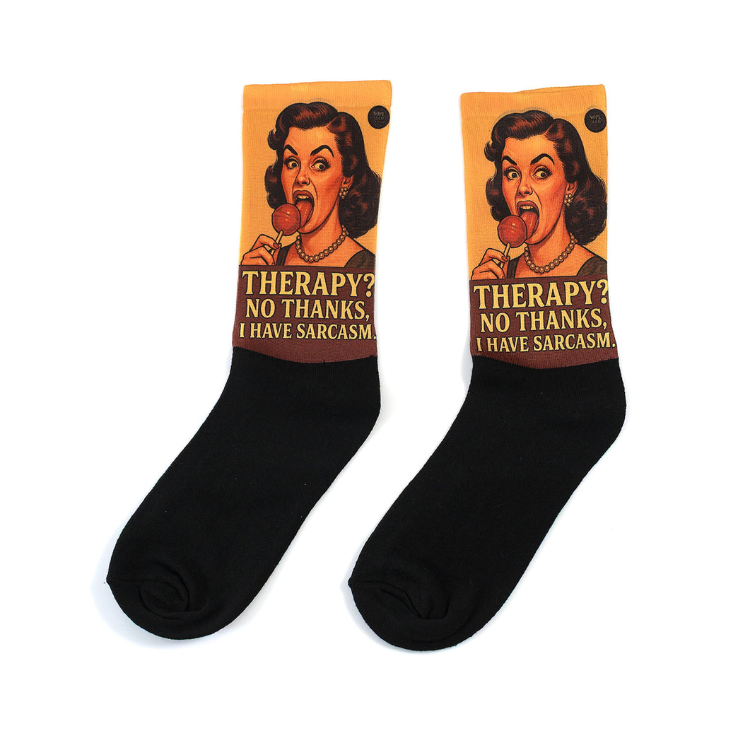 Забавни чорапи – „Терапия? Не, благодаря – владея сарказма“ Забавни чорапи – „Терапия? Не, благодаря – владея сарказма“ Тези чорапи са създадени за хората, които не просто използват сарказма...