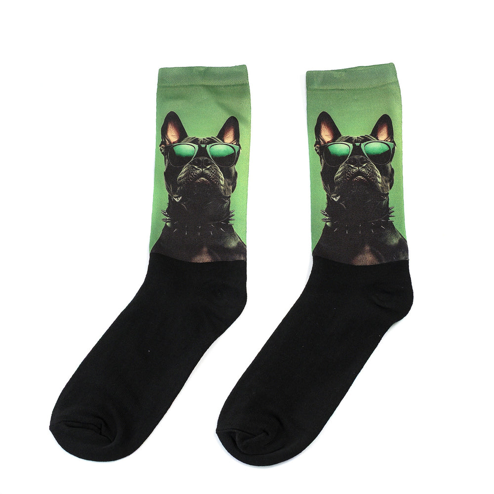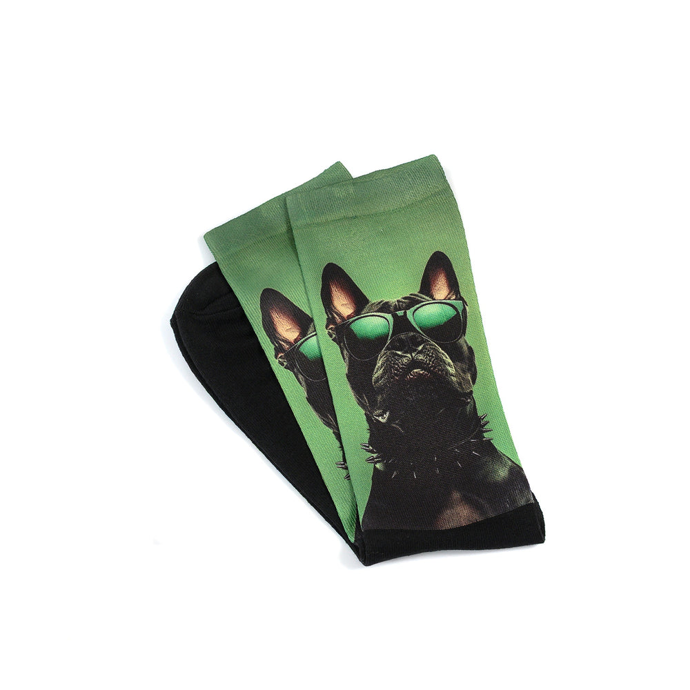 Diese Socken sind perfekt für alle, die Hunde, Stil und eine Prise verspieltes Selbstbewusstsein lieben. Das Design zeigt eine Französische Bulldogge – niedlich und selbstbewusst zugleich, mit verspiegelter grüner Brille und einem Nietenhalsband, die ihr einen leicht coolen Charme verleihen. Die Kombination aus „niedlich“ und „treuer Bestie“ macht dieses Modell ideal für alle, die gerne etwas Besonderes, Fröhliches und Persönliches tragen.